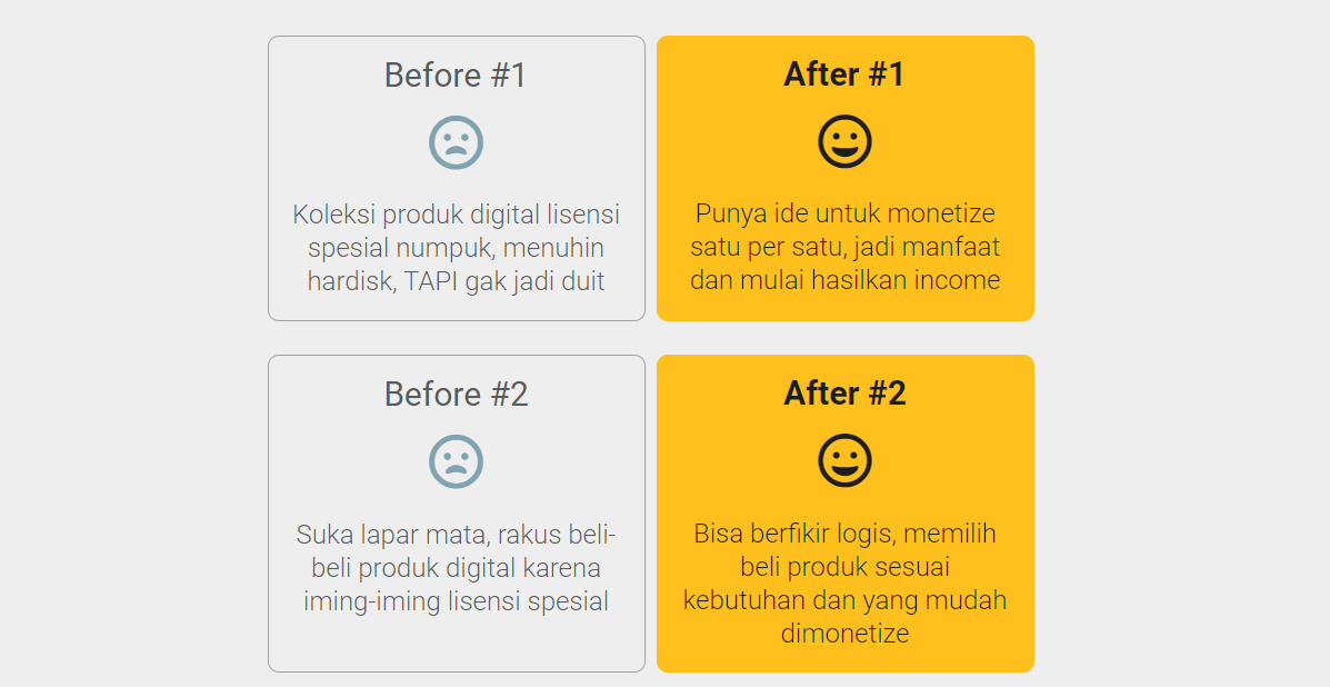 Before #1: Koleksi produk digital lisensi spesial menumpuk, memenuhi hardisk, tapi tidak menghasilkan uang. After #1: Punya ide untuk memonetisasi satu per satu, jadi bermanfaat dan mulai menghasilkan pendapatan.